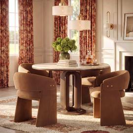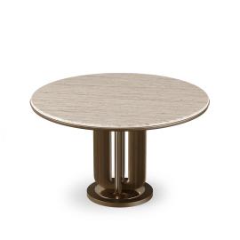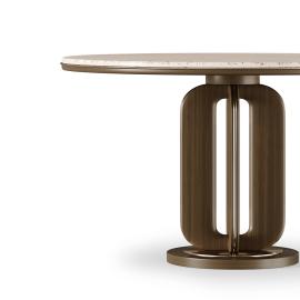 Sophisticated blend of sculptural design and refined materials, this is the Girard Dining Table. Its round tabletop, crafted in a light stone finish, creates a soft contrast against the warmth of the wooden base. The central pedestal features a distinctive geometric form, combining curved wooden panels with polished brass accents that add depth and subtle luminosity. This architectural base not only supports the structure but defines the table’s elegant identity.