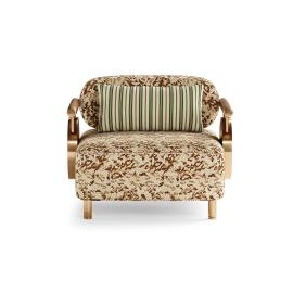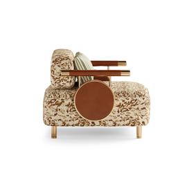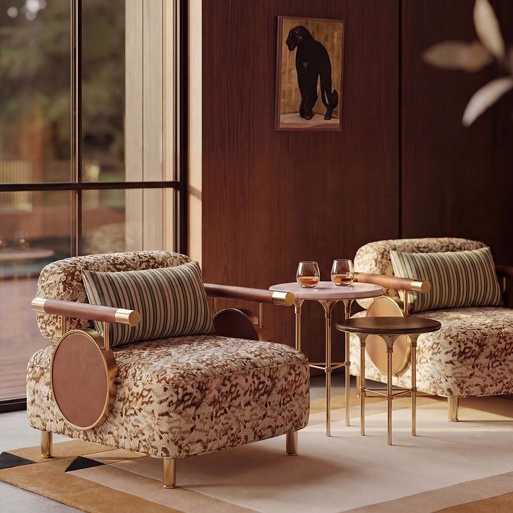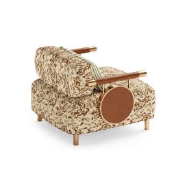 The Gio Armchair combines bold geometry with mid-century elegance. Its fully upholstered seat and backrest feature a rich patterned fabric, offering both comfort and visual depth. Distinctive cylindrical wooden armrests, supported by circular panels and polished brass details, create a striking architectural statement. A sculptural and refined piece that brings character and timeless style to any interior.