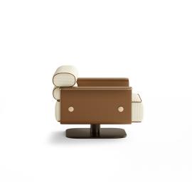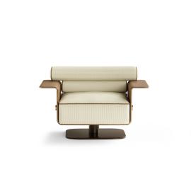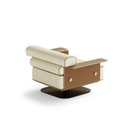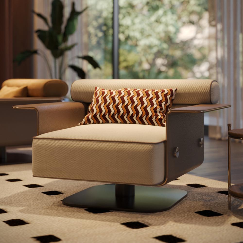 The Nelson Armchair reimagines mid-century modern comfort with distinctive architectural elegance. The backrest features two sculptural upholstered rolls, creating a striking visual identity and providing layered ergonomic support. The armrests are seamlessly integrated into the chair’s structure, and its square-shaped seat offers generous proportions. This thoughtful construction highlights the craftsmanship and stability behind the design.